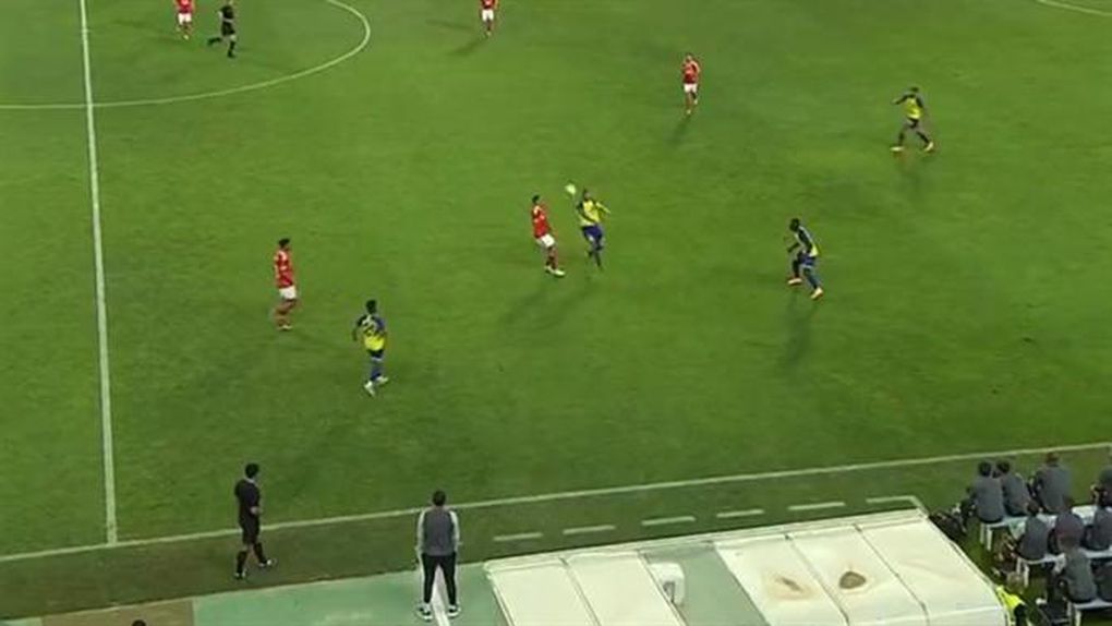 O argentino tirou a bola do alcance do avançado dos sauditas com toque de classe, sendo travado em falta por CR7.