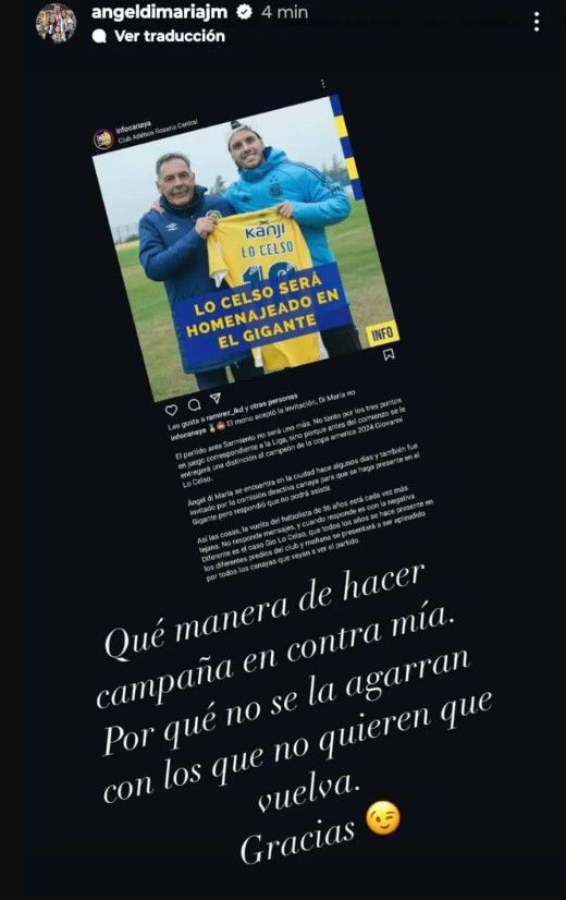 «Lo Celso aceitou o convite, Di María não.» É assim que começa a publicação da página Infocanaya, de apoio ao clube da cidade de Rosario. «O jogo frente a Sarmiento não será mais um. Antes da partida, vai haver uma distinção a Giovani Lo Celso, vencedor da Copa América 2024. Ángel Di María está na cidade e também foi convidado pela direção para estar presente, mas respondeu que não podia ir», explica a página que, depois, se 'atira' ao jogador.