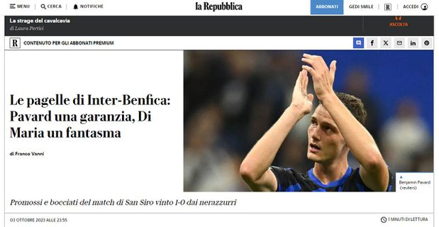 O jornal La Repubblica diz que Di María – que saiu lesionado – foi «um fantasma» no Benfica e que o guarda-redes Trubin «evitou o pior para os portugueses. «Porquê o Inter? É o que diz a cara de Rafa Silva após a terceira investida seguida de Pavard. A mesma expressão que os dirigentes do Benfica fizeram em Monte Carlo, no dia 31 de agosto, no sorteio. Maldita bola. Um analista de jogos do clube português, na fila para o café no bar do estádio dizia após a derrota ‘Não sabes o quanto odiamos esta música em Lisboa’, enquanto San Siro entoava ‘por todos os quilómetros que fiz por ti, o Inter tem que vencer’, hino da caminhada dos nerazzurri à final da última edição da Liga dos Campeões.»