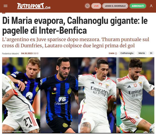 O Tuttosport vai pelo mesmo caminho, referindo que Di María «se evaporou»: «O argentino ex-Juve desapareceu depois de meia hora de jogo (...) Os nerazzurri dominaram por longos períodos o jogo em casa frente à equipa portuguesa de Di Maria, só conseguindo abrir o marcador aos 62 minutos graças ao golo de Thuram. A equipa de Inzaghi criou muitas oportunidades, poderia ter ampliado a vantagem sem problemas, mas deixou a desejar na fase de execução. Não houve problemas, porém, já que a partida terminou 1-0.»