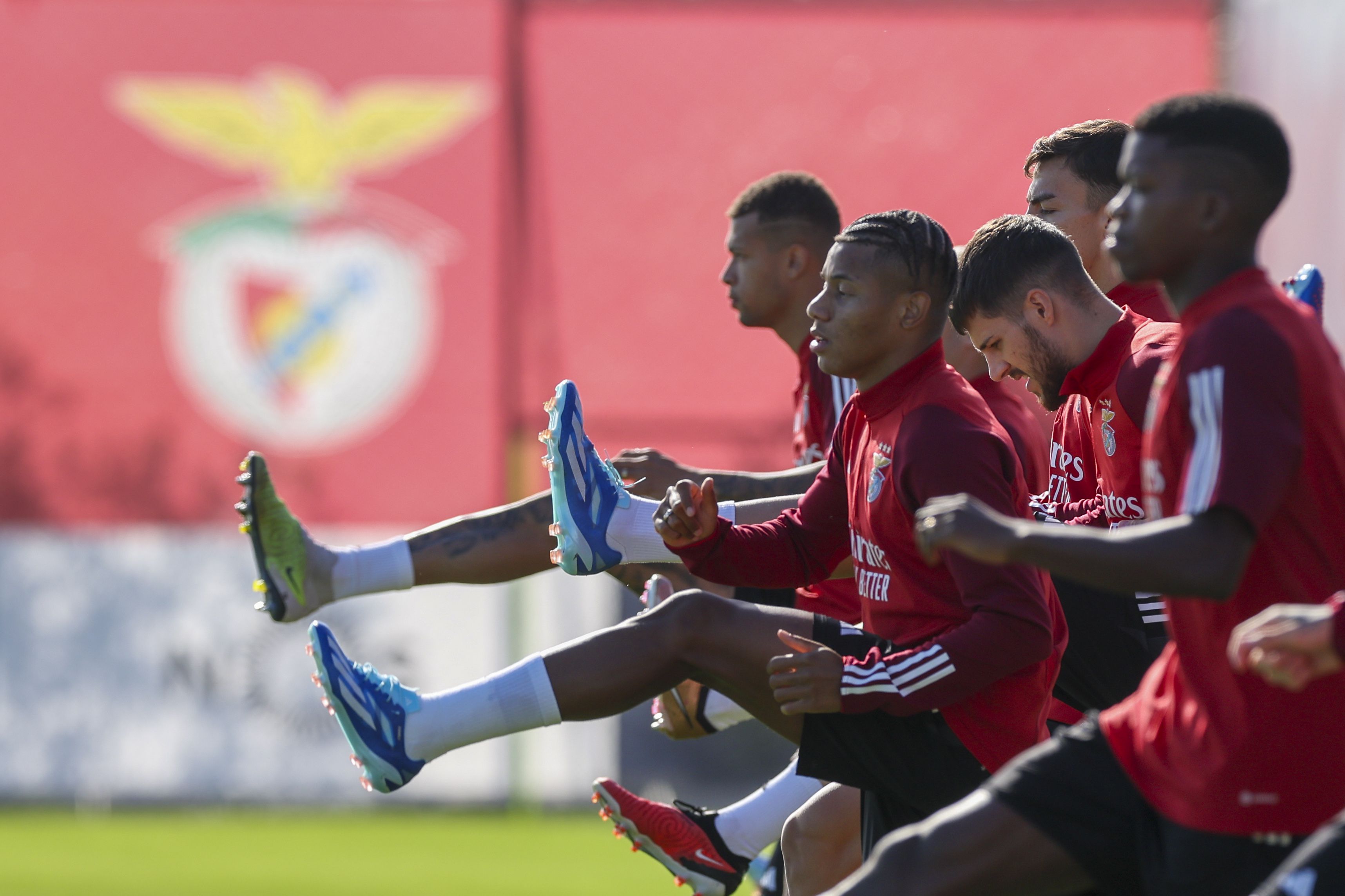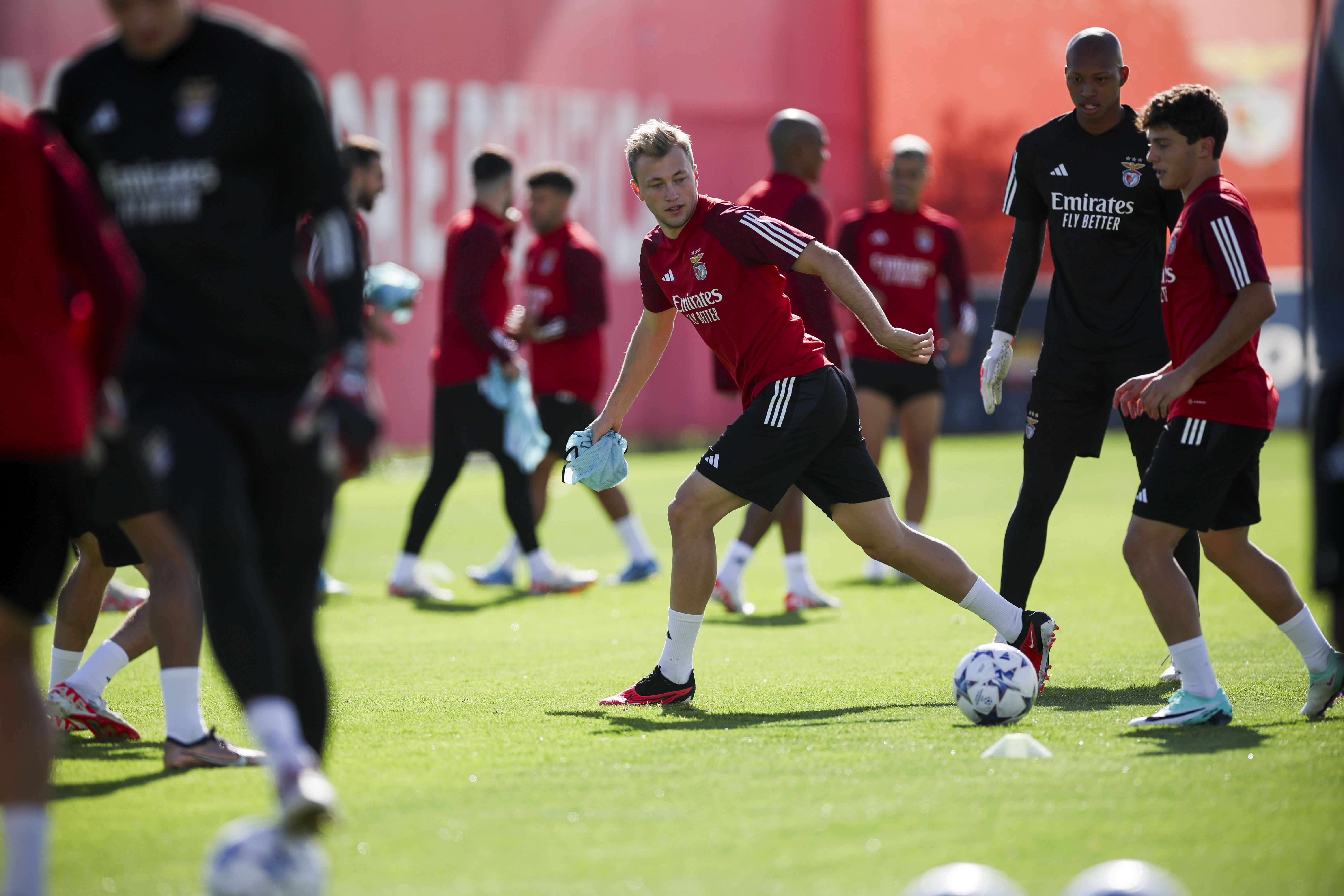 Ángel Di María, Orkun Kokçu e Alexander Bah estão esta manhã no relvado para o treino do Benfica, antes do jogo com a Real Sociedad para a Liga dos Campeões.