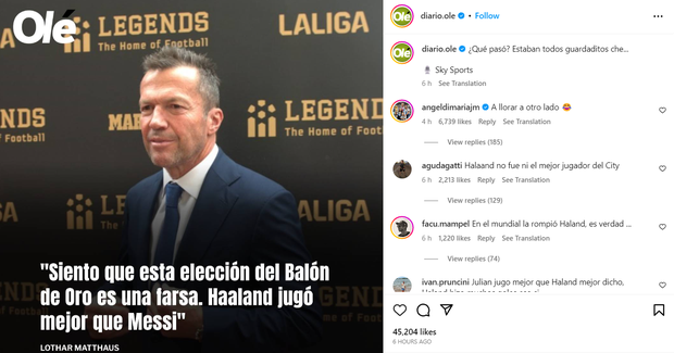 Lottar Matthaus, ex-internacional alemão e antiga glória de Bayern Munique e Inter, não poupou nas críticas à votação da Bola de Ouro da passada época. Para o ex-jogador, esta edição do prémio da France Football, que distingue o melhor jogador do Mundo, é «uma farsa», adicionando que «Haaland jogou muito melhor que Messi».