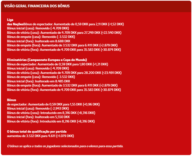 - Samme bonussats som Herrelandsholdet i Nations League-kampe samt for sejre i kvalifikationskampe på hjemmebane.