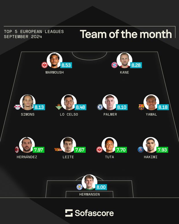 Eis o onze completo: Hermansen (Leicester); Theo Hernández (Milan), Diogo Leite (Union Berlim), Tuta (Frankfurt), Hakimi (PSG); Xavi Simons (Leipzig), Lo Celso (Betis), Cole Palmer (Chelsea), Lamine Yamal (Barcelona); Marmoush (Frankfurt) e Kane (Bayern).