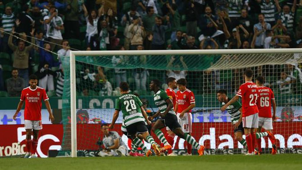 Canto marcado por Nuno Santos a encontrar a cabeça de Ousmane Diomande, que, imperial, faz o 2-0 para o Sporting frente ao Benfica, em Alvalade.