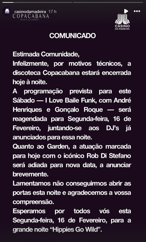 Por sua vez, a atuação de Rob Di Stefano, que estava marcada para o espaço Garden, foi adiada para uma data a anunciar posteriormente. No mesmo comunicado, a gerência lamentou o sucedido e agradeceu a compreensão do público, aproveitando para convidar os clientes para a noite de segunda-feira, 16 de fevereiro, intitulada Hippies Go Wild.