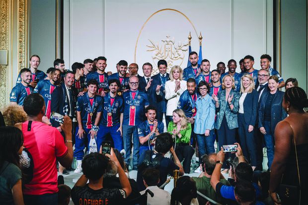 À chegada à residência oficial de Emmanuel Macron, o presidente francês começou por dirigir uma mensagem sobre os desacatos da noite anterior, que causaram dois mortos, dois jovens de 17 e 23 anos «Nada pode justificar aquilo que aconteceu nas últimas horas. É inaceitável, tiraram a felicidade aos nossos compatriotas. Duas pessoas morreram. A nação está de luto. Seremos implacáveis. O futebol não é isso», disse o chefe de Estado francês, ontem, na presença dos vencedores. A seguir chegaram os elogios e agradecimentos. «Finalmente é Paris! Há 32 anos vibrei noutra final de Munique, do Marselha, e 32 anos depois, vocês venceram a Liga dos Campeões. Fizeram-no de forma sublime e monstruosa. São campeões, todos nós vibrámos. É a vitória de um equipa inteira, unida. Do estado de espírito, da vontade, da solidariedade, da ambição. É o futebol que gostamos de ver», disse, num discurso que deixou o capitão Marquinhos em lágrimas, antes de elogiar o trabalho de Luis Enrique, que «criou uma forma de ser», e Luís Campos: «Obrigado. Construiu uma grande equipa.»