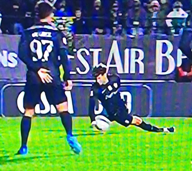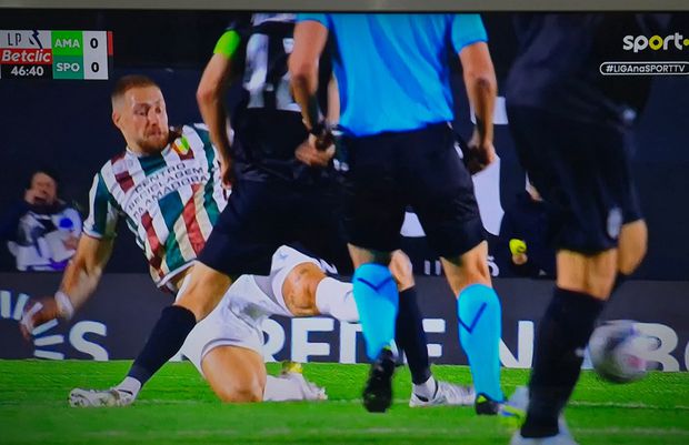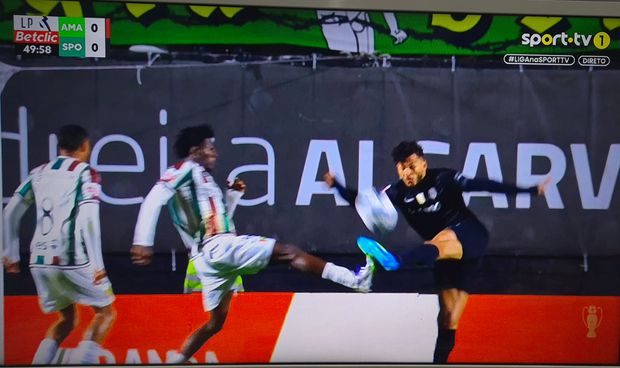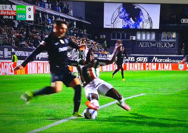 50' Penálti. Doué estica a sua perna direita, entra de sola, não toca na bola e acerta no pé esquerdo de Luis Suárez que chegou primeiro e que tinha tocado no esférico. O jogo perigoso só é passível de ser sancionado com pontapé livre indireto quando não há contacto sobre o adversário. A partir do momento em que esse contacto existe, passa a ser punido com livre direto, ou, sendo no interior da área, penálti. Castigo máximo por assinalar para os leões.