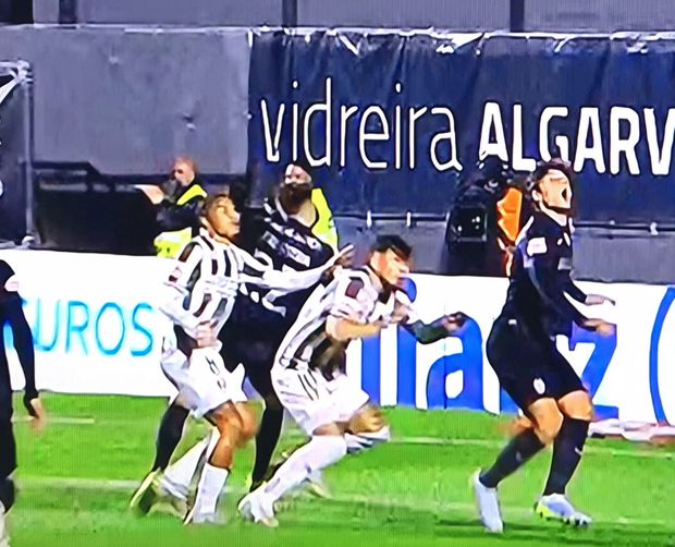 70' mão de apoio. Após um remate de Jovane a bola vai ao braço direito de Maxi Araújo que está a ir na direção do solo em apoio à queda. Os jogadores quando em queda têm direito a apoiar a mão no solo e, caso a bola lhe bata no braço/mão não é penalizado, é uma atenuante. Sem penálti.