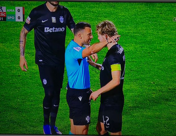 57' Ambos errados. Nem o árbitro se deve aproximar tanto de Hjulmand para falar com ele, cara a cara, nem este pode colocar a sua mão no peito do árbitro para o afastar, ainda por cima sendo o capitão. Árbitro errou na postura e distância e o jogador errou na reação.