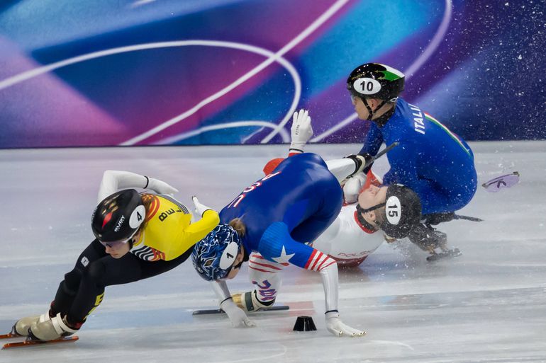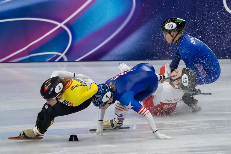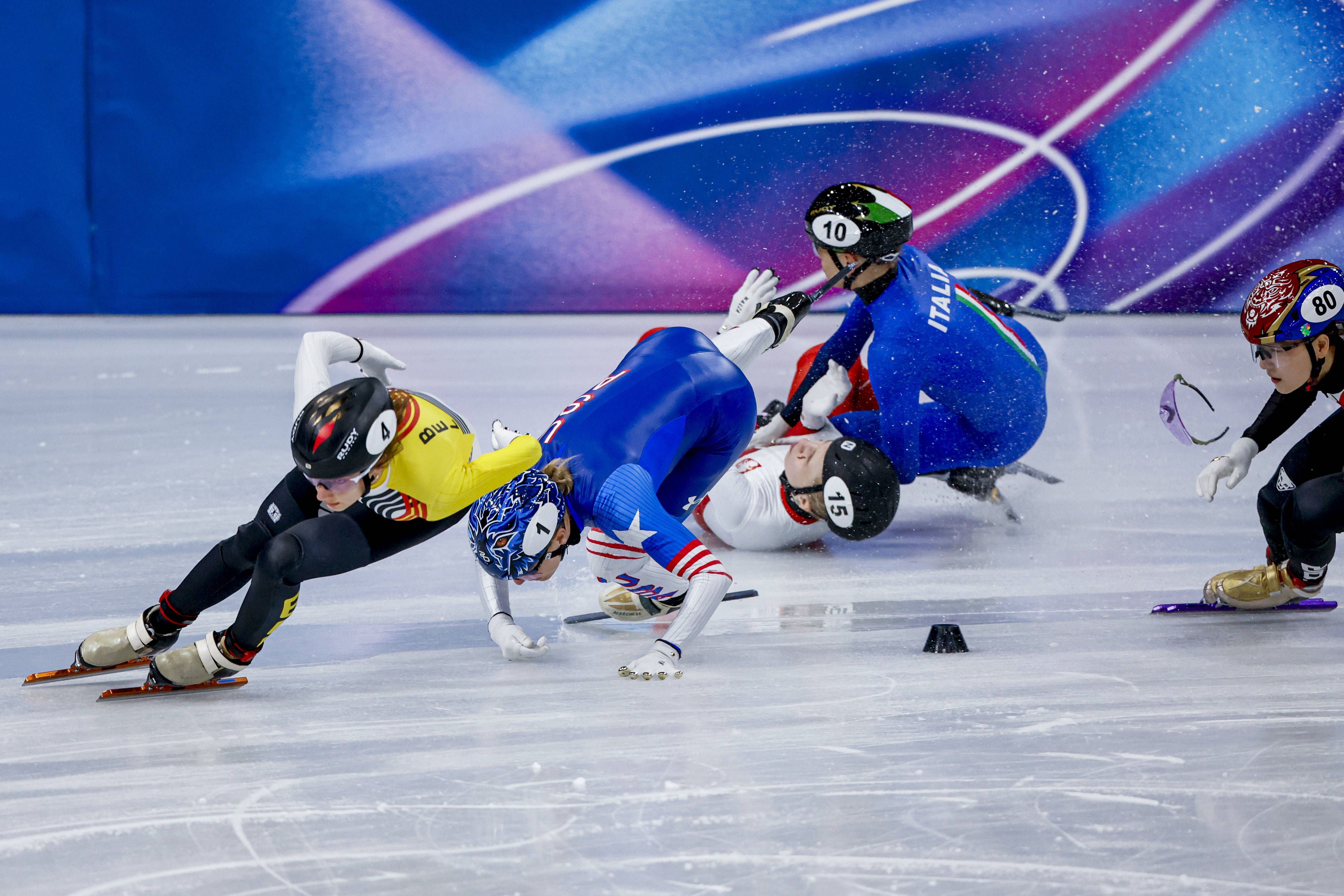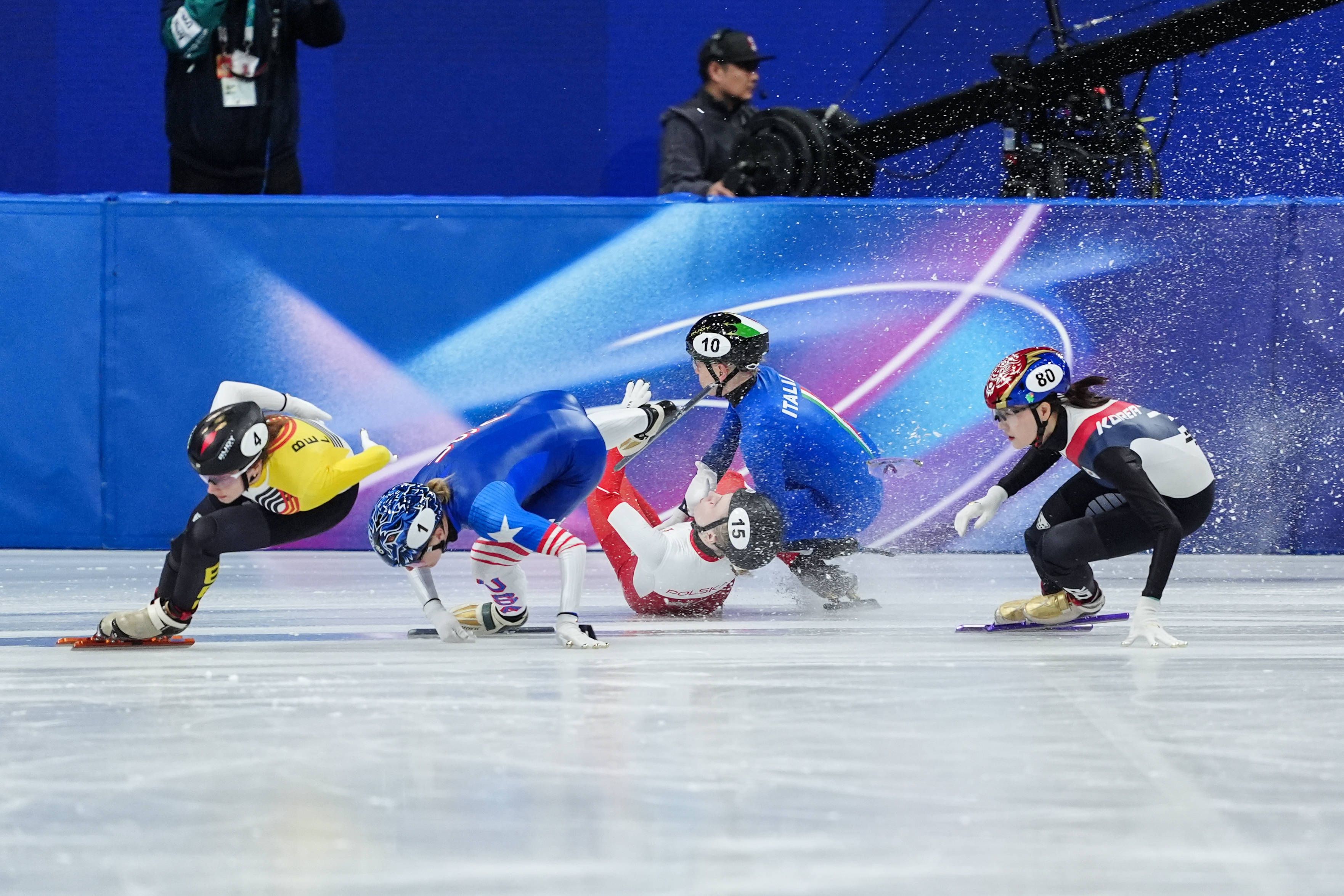 O patim da americana Kristen Santos-Griswold acabou por ficar perigosamente perto do seu olho esquerdo. Após a rápida intervenção das equipas médicas, a patinadora polaca de short track foi retirada de maca, e ao sair, fez um sinal de polegar para cima para o público, indicando que estava bem. A americana foi desqualificada pelo incidente.