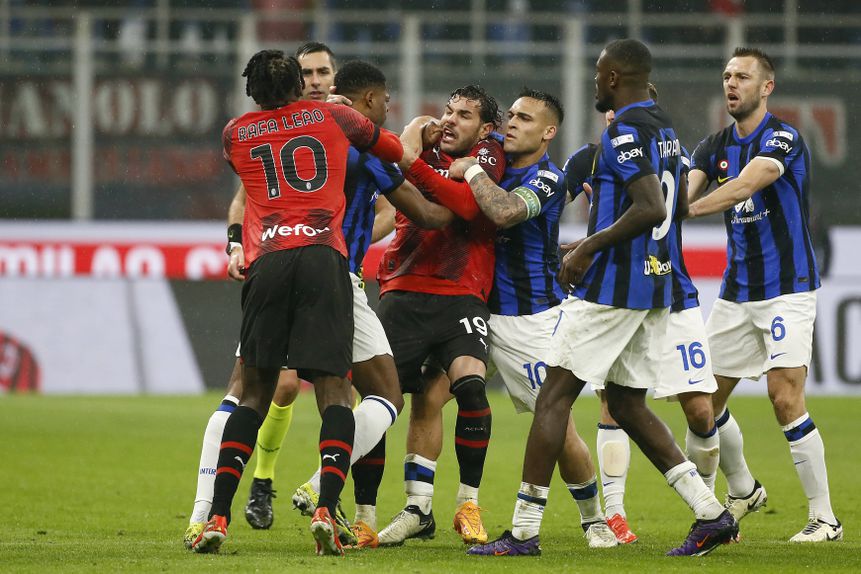 Lateral neerlandês do Inter exibiu um cartaz em que Theo Hernández, do Milan, aparecia preso com uma coleira; desentendimento entre ambos no Derby della Madonnina na origem das provocações