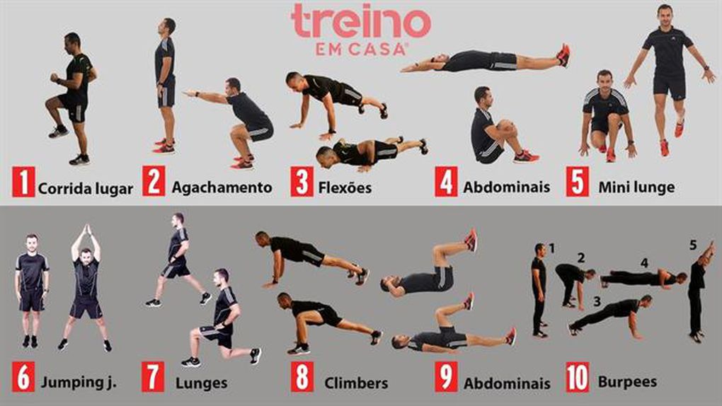 Protocolo: Treino funcional em circuito com 10 exercícios, realizando cada exercício durante 45 segundos com 15 segundos de intervalo. O objetivo é fazer as redondas definidas no menor tempo possível. Faça o descanso que considerar necessário entre séries. Fazer 3-5 rondas do circuito de acordo com a sua condição física.