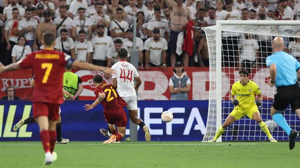 O avançado argentino Paulo Dybala deu vantagem à Roma, aos 35 minutos, na final da Liga Europa UEFA, a decorrer na Puskás Arena, de Budapeste (Hungria) na noite desta quarta-feira, diante do Sevilha, de Espanha, num remate de pé esquerdo, a corresponder a assistência de Mancini após Cristante ter ganho a bola.
