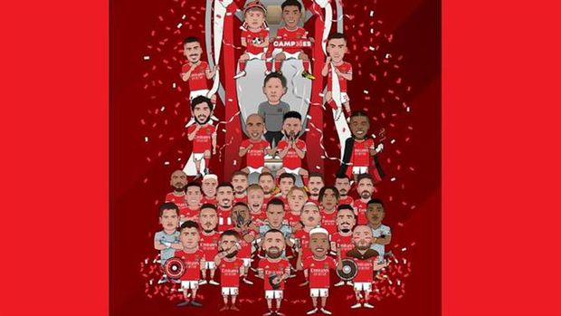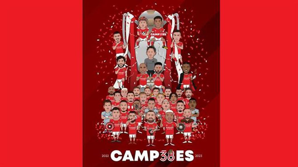 O Benfica partilhou, este domingo,um poster em caricatura de dos 32 jogadores que conquistaram, este sábado, o 38.º título de campeão nacional, a par do treinador Roger Schmidt.