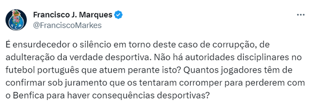 «É ensurdecedor o silêncio em torno deste caso de corrupção, de adulteração da verdade desportiva. Não há autoridades disciplinares no futebol português que atuem perante isto?» - assim comentou Francisco J. Marques a confirmação que Lionn deu esta sexta-feira, em tribunal.