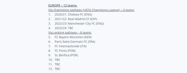Da Europa entram 12 clubes, seis da América do Sul – já garantidos Palmeiras, de Abel Ferreira, mais Flamengo e Fluminense - e quatro de África, Ásia, América Norte/Central, e um de Oceânia, além de um do país anfitrião.