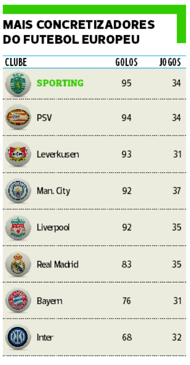 Um registo que coloca o leão, desde logo, no topo das equipas dos principais campeonatos europeus. Na frente de colossos como Manchester City, PSG, Real Madrid, Liverpool, Leverkusen, Inter de Milão ou PSV. Nos campeonatos que se encontram à frente do português no ranking da UEFA — Espanha, Inglaterra, Itália, França, Alemanha e Países Baixos — é o Sporting quem lidera. Com os recentes três golos apontados na Suíça, ao Young Boys, o Sporting chegou aos 95 golos nas 34 partidas oficiais de 2023/2024. Está, por isso, a cinco festejos da marca redonda dos 100 golos. Um número marcante que, para já, promete dizimar os 131 golos apontados nos… 53 jogos da pretérita temporada.