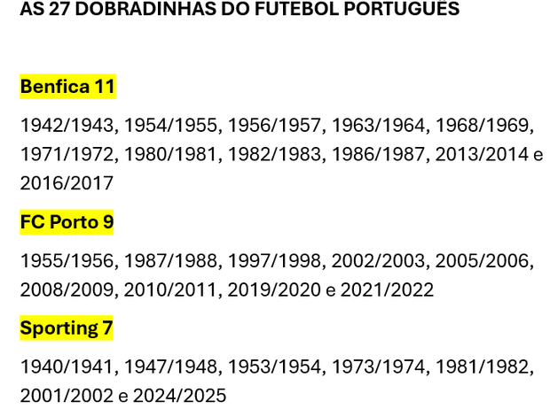 O Benfica continua a ser quem mais dobradinhas tem, o que é natural, pois é a equipa com mais Campeonatos/Ligas (38) e mais Taças de Portugal (26). Chegou ao 2 em 1 por 11 vezes: 1942/1943, 1954/1955, 1956/1957, 1963/1964, 1968/1969, 1971/1972, 1980/1981, 1982/1983, 1986/1987, 2013/2014 e 2016/2017. Nos últimos 50 anos, sagrou-se 18 vezes campeão nacional, mas apenas por cinco vezes lhe juntou a Taça de Portugal.