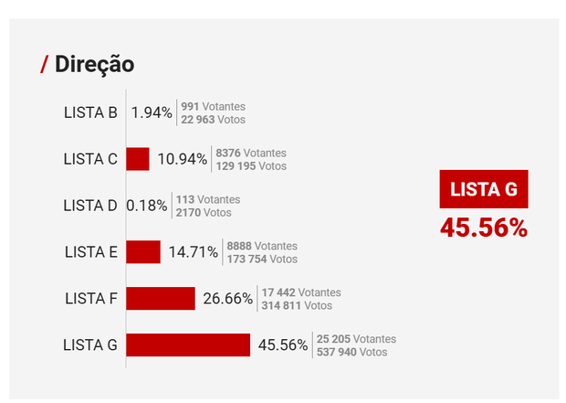 Às 15:58 em Portugal Continental, o presidente reúne 44,23% dos votos, com uma vantagem confortável sobre a Lista F de João Noronha Lopes, com 28,30%.