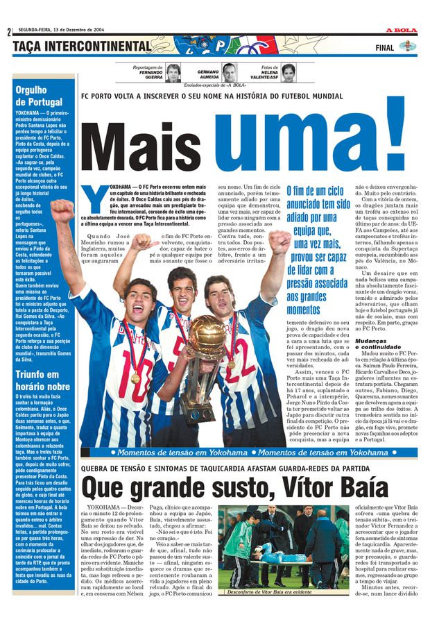 Num jogo intenso, repleto de emoções e peripécias, a equipa de Víctor Fernández bateu o Once Caldas por 8-7 nas grandes penalidades, após 120 minutos sem golos. A superioridade dos azuis e brancos foi evidente: três remates aos ferros da baliza adversária, dois golos anulados a Benni McCarthy e, já no prolongamento, uma substituição inesperada. Vítor Baía, símbolo de liderança e segurança na baliza, teve de ser rendido por Nuno Espírito Santo após sentir um peso no peito – a explicação surgiria posteriormente. Exames revelaram que tudo se deveu a uma quebra de tensão e sintomas de taquicardia, sem gravidade. Naquele momento o susto foi grande, avivando memórias ainda recentes da perda de Fehér, em janeiro desse ano, num V. Guimarães-Benfica disputado no Estádio D. Afonso Henriques.