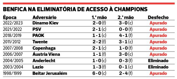 Se frente ao Nice, na segunda mão da terceira pré-eliminatória já deste ano, a equipa de Bruno Lage não sentiu problemas — o facto de ter chegado de França com vantagem de 2-0, ao contrário do que acontece agora, ajudou e muito —, convém lembrar que na época passada o Benfica só venceu um de seis jogos europeus em casa: o primeiro, 4-0 ao Atlético de Madrid; seguiram-se derrotas com Feyenoord e Barcelona (duas vezes) e empates com Bolonha e Mónaco...