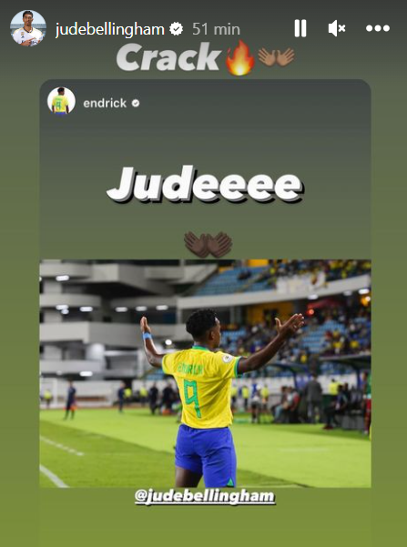 Nas redes sociais, Bellingham partilhou a fotografia de Endrick: «Craque.»