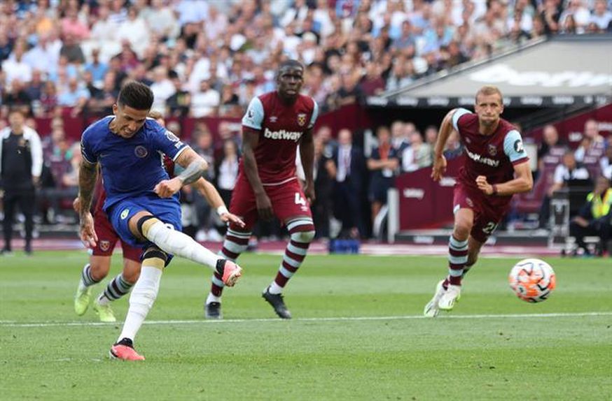Aos 43 minutos, o árbitro assinou penálti por derrube de Sterling na área dos hammers e o médio argentino Enzo Fernández foi chamado a converter o castigo máximo... mas falhou.