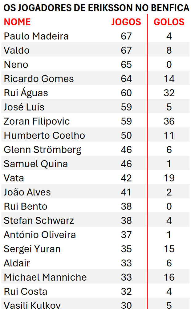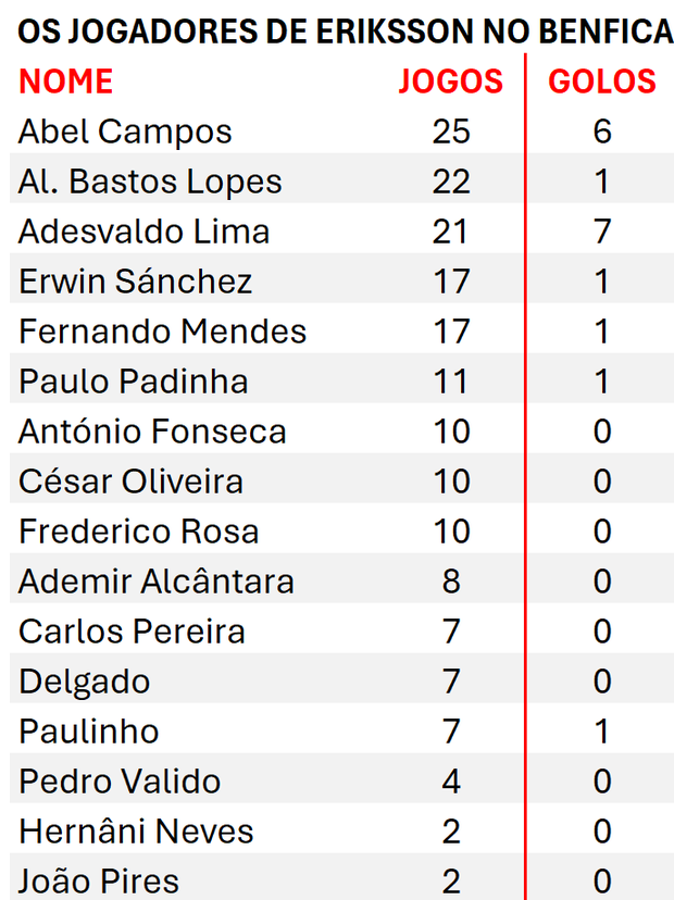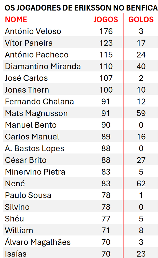 Eriksson no Benfica: quem fez mais jogos, quem é o goleador?