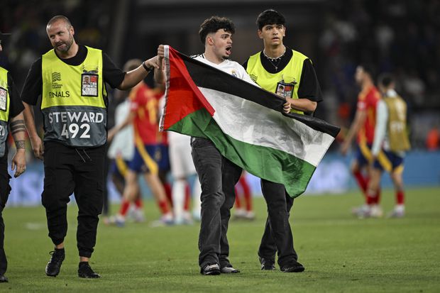 Após o apito final do emocionante jogo entre Espanha e França (5-4), um espectador que estava na bancada central driblou o cordão de segurança e invadiu o relvado do estádio em Estugarda com uma bandeira da Palestina.