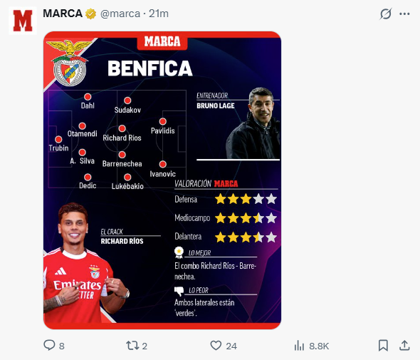 Mais tarde, o jornal espanhol colocou novo post no X, já com José Mourinho como treinador, alterações no onze e na figura em destaque (desta vez, é Pavlidis):