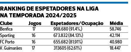 O que se conclui do cruzamento de dados relativos apenas à principal competição nacional, é que o FC Porto, num ano em que passou a fasquia dos 150 mil sócios, podia ter ultrapassado o Sporting em número de espetadores. O que falhou? As assistências caíram a pique no final de 2024 e neste ano civil, fruto dos resultados e do desânimo que se apoderou de boa parte da massa associativa.
