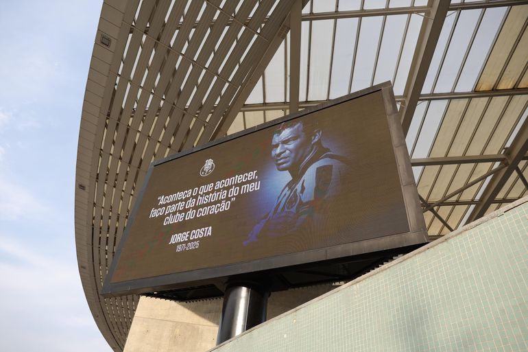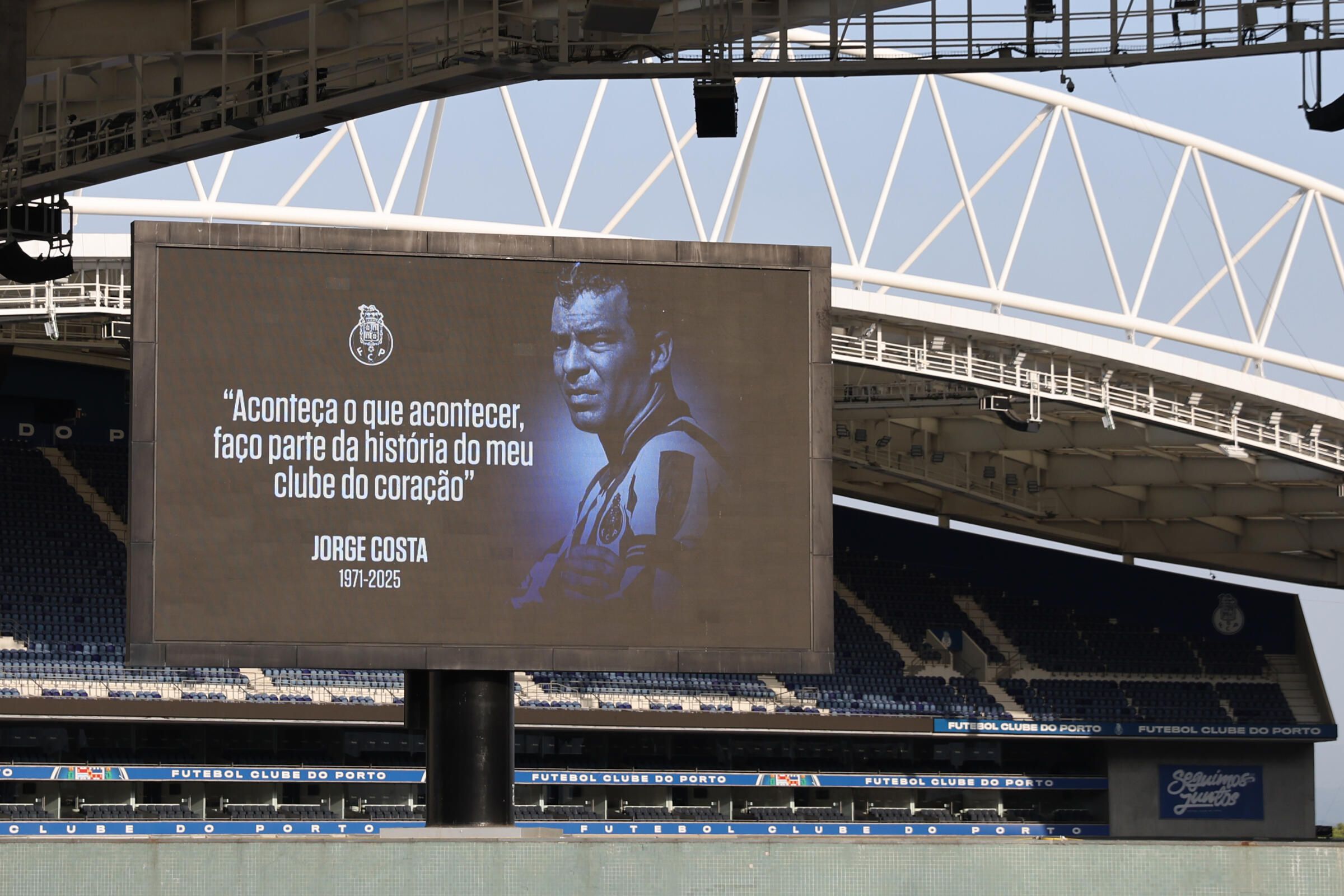 Ecrã com palavras de Jorge Costa: «Aconteça o que acontecer, faço parte da história do meu clube de coração» (Foto: Catarina Morais/Kapta+)