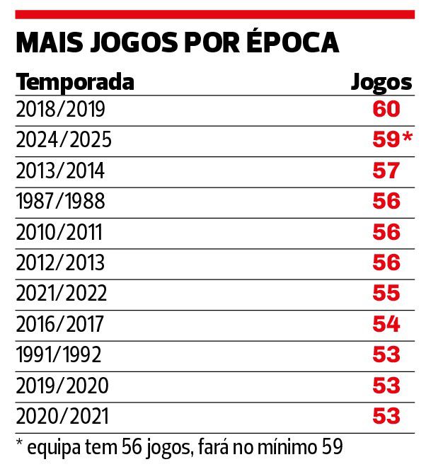 Tem 56 partidas realizadas e fará no mínimo 59, apenas atrás das 60 alcançadas em 2018/19, quando foi campeão, também com Bruno Lage a treinador, que entrou já com a temporada a decorrer para substituir Rui Vitória.