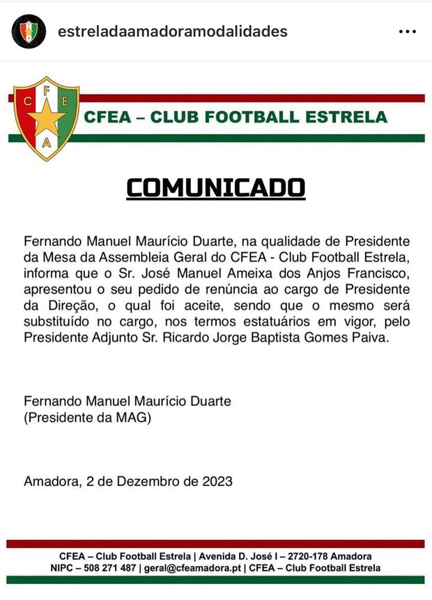No seguimento do duplo pedido de demissão de José Manuel Francisco, que em simultâneo deixou os cargos de presidente do Estrela da Amadora - clube – e de administrador financeiro da SAD dos tricolores, o emblema da Reboleira imediatamente reorganizou a sua estrutura, bastando para tal cumprir o regulamento dos seus estatutos e procedendo imediatamente à sua substituição.