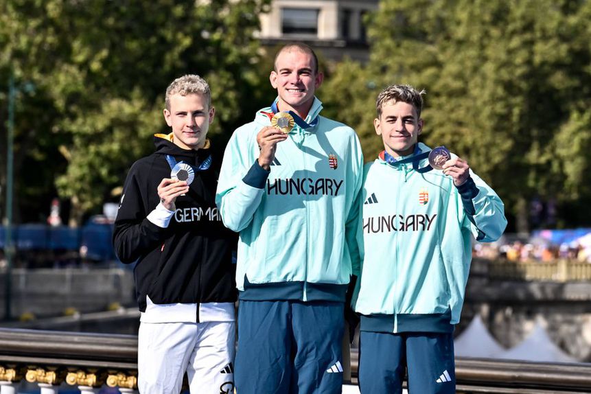 Oliver Klemet, Kristof Rasov e David Betlehem no pódio de águas abertas nos Jogos de Paris 2024