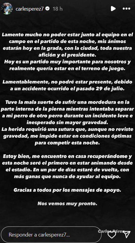 Após ter recebido alta hospitalar, Carles Pérez esclareceu, numa história na rede social Instagram, as circunstâncias do ataque que de foi alvo por parte de um cão, que o levou de urgência para o hospital.