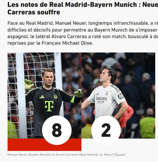 A avaliação negativa do L’Équipe estendeu-se a quase toda a equipa do Real Madrid, que recebeu uma nota global de 4,1. Dos onze titulares, apenas Brahim e Mbappé escaparam à avaliação negativa, enquanto o treinador, Arbeloa, recebeu uma nota 4. Em contraste Manuel Neuer, melhor em campo, teve nota 8.