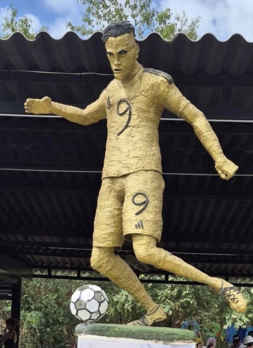 A estátua de Falcao, criada por Alonso Ramirez, tem 170 cm de altura e pesa mais de 180 kg, toda em dourado.