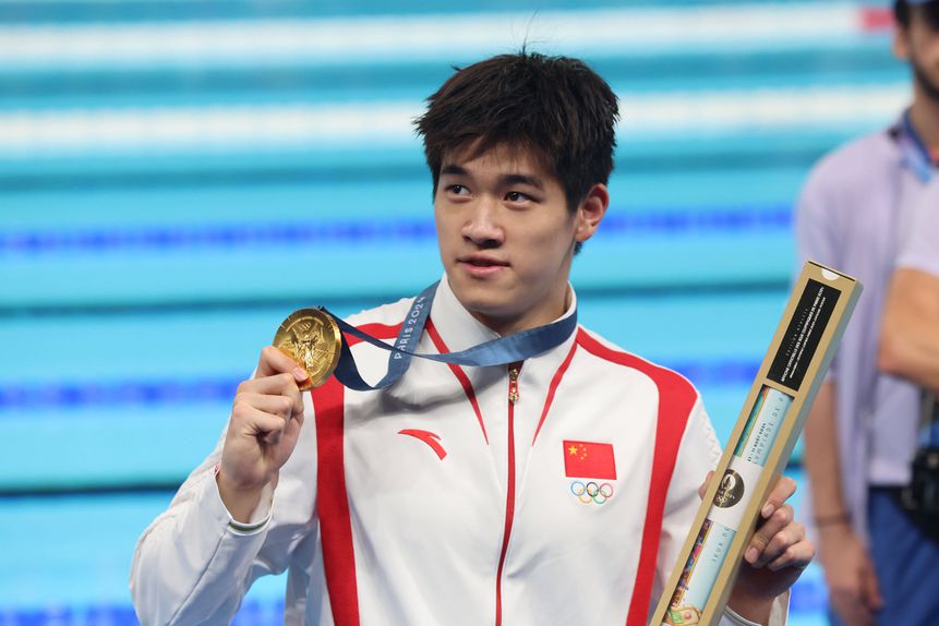 Oan Zhanle com o ouro dos 100 metros livres (IMAGO / ZUMA Press Wire)