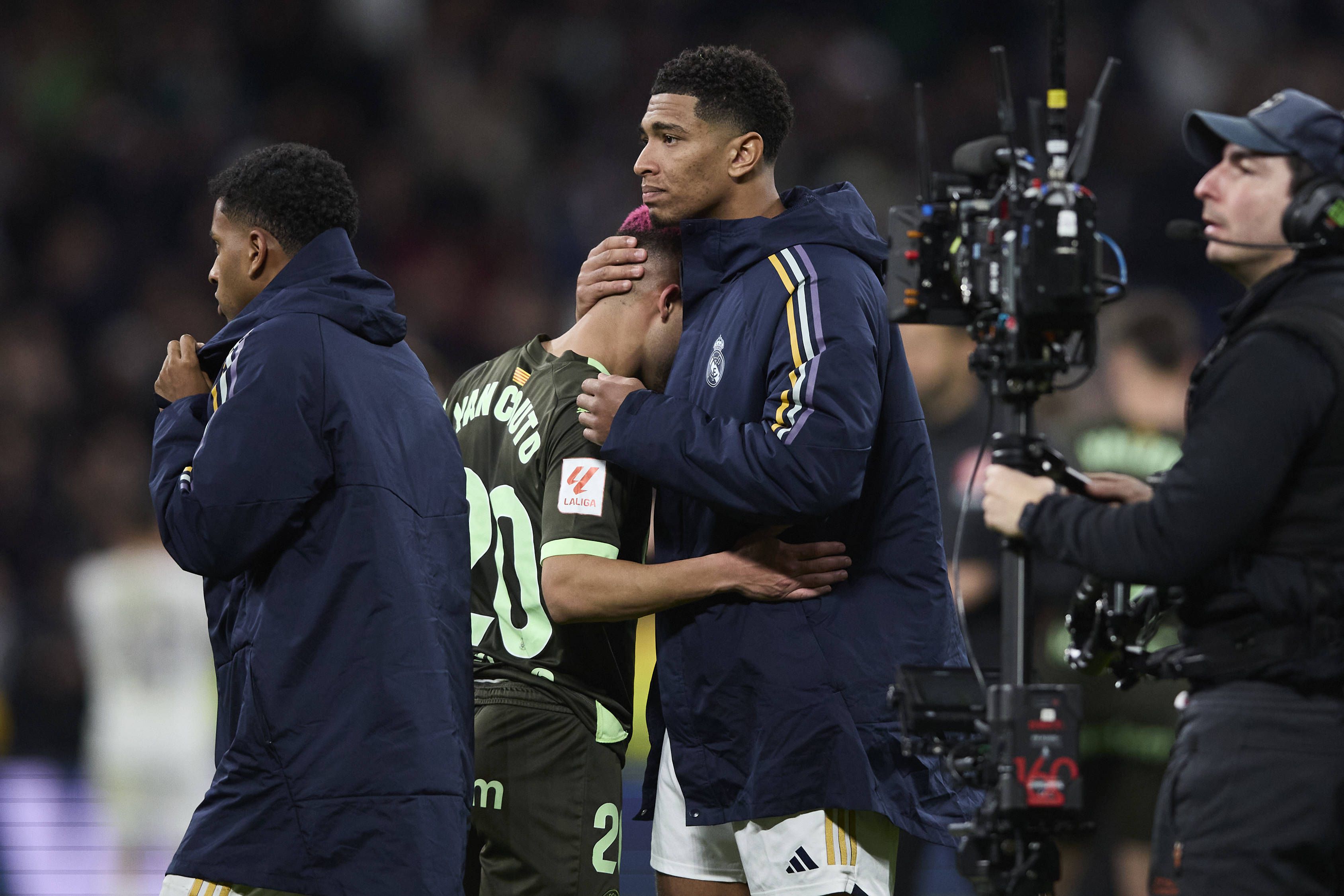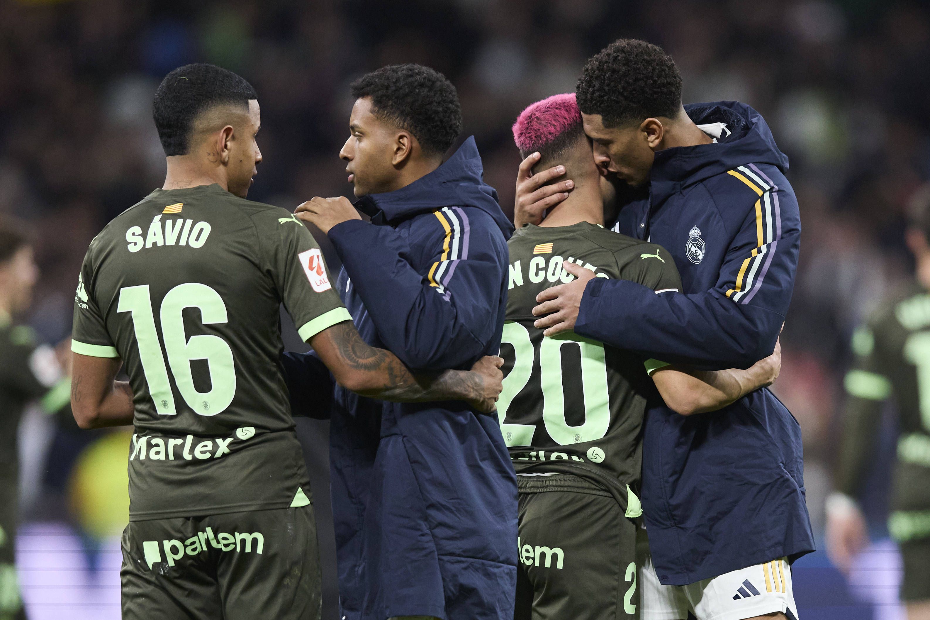 Após o apito final, o internacional brasileiro foi consolado pelos colegas de equipas e também por adversários, como Rodrygo, Bellingham e Vinícius.