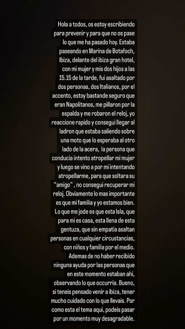 «Olá a todos, escrevo este texto para vos avisar para que não vos aconteça o que me aconteceu hoje. Estava a passear na marina de Botafoch, Ibiza, em frente ao Ibiza Gran Hotel, com a minha mulher e os meus dois filhos, quando fui assaltado por duas pessoas às 15:15 da tarde. Dois italianos, pelo sotaque, tenho quase a certeza de que eram napolitanos, apanharam-me por trás e roubaram-me o relógio, reagi rapidamente e consegui chegar ao ladrão que estava a tentar fugir numa mota que o esperava do outro lado do passeio. A pessoa que conduzia tentou atropelar a minha mulher e depois veio atrás de mim, tentando atropelar-me, para que largasse o seu “amigo”. Não consegui recuperar o meu relógio, mas o mais importante é que eu e a minha família estamos bem.