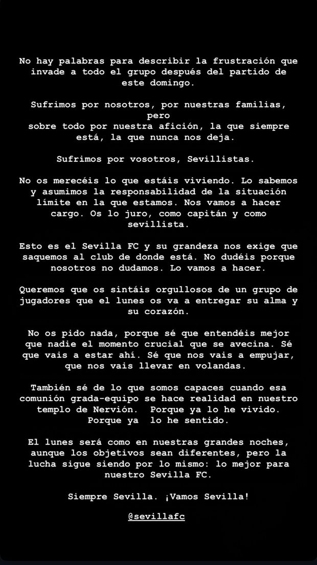 O médio acabou a mensagem a prometer uma resposta já na segunda-feira, na receção à Real Sociedad, a contar para a jornada 34: «Segunda-feira será como as nossas grandes noites, embora os objetivos sejam diferentes. Mas a luta continua a ser pelo mesmo: o melhor para o nosso Sevilha.»
