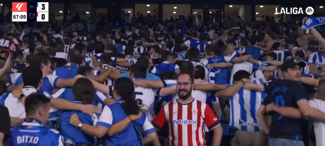 A dada altura é possível ver os adeptos da Real Sociedad em êxtase, perante a vantagem de três golos da sua equipa, e lá no meio... alguns adeptos do Athletic, perdidos no «mosaico» azul e branco, mas a encarar tudo com desportivismo.