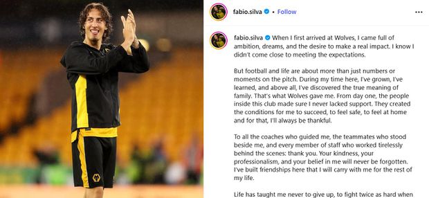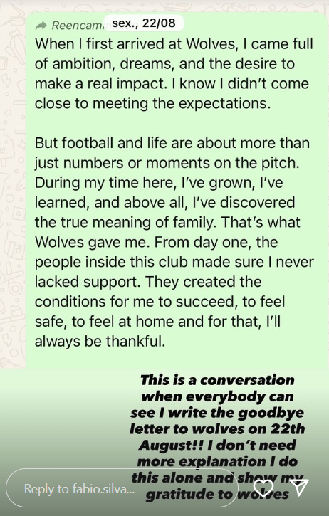 «Quando cheguei ao Wolves, cheguei cheio de ambição, sonhos e vontade de causar um impacto real. Sei que não cheguei nem perto de corresponder às expectativas. Mas o futebol e a vida são mais do que apenas números ou momentos em campo. Durante o meu tempo aqui, cresci, aprendi e, acima de tudo, descobri o verdadeiro significado da família. Foi isso que o Wolves me deu. Desde o primeiro dia, as pessoas dentro deste clube garantiram que nunca me faltasse apoio. Elas criaram as condições para que eu tivesse sucesso, para me sentir seguro, para me sentir em casa e, por isso, serei sempre grato. A todos os treinadores que me guiaram, aos companheiros de equipa que estiveram ao meu lado e a todos os membros da equipa que trabalharam incansavelmente nos bastidores: obrigado. A vossa gentileza, o vosso profissionalismo e a vossa fé em mim nunca serão esquecidos. Construí amizades aqui que levarei comigo para o resto da minha vida. A vida ensinou-me a nunca desistir, a lutar com o dobro de força quando as coisas não correm como planeado. Sempre tentei me manter fiel a isso, continuar buscando minha felicidade e bem-estar, mesmo quando o caminho ficou difícil. Saio com um sentimento agridoce, mas também com orgulho, sabendo que dei tudo de mim e nunca parei de tentar. Agora é hora de um novo capítulo, mas não vou esquecer onde estive. Sempre serei mais um torcedor deste clube. Obrigado, wolves. Do fundo do meu coração.»