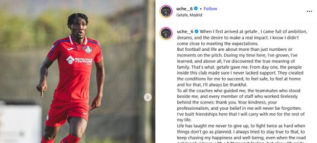 Ora ontem o nigeriano Chrisantus Uche, a caminho do Crystal Palace, despediu-se do Getafe... exatamente com o mesmo texto, também em inglês, que agradece a colegas, treinadores e adeptos, de forma genérica.