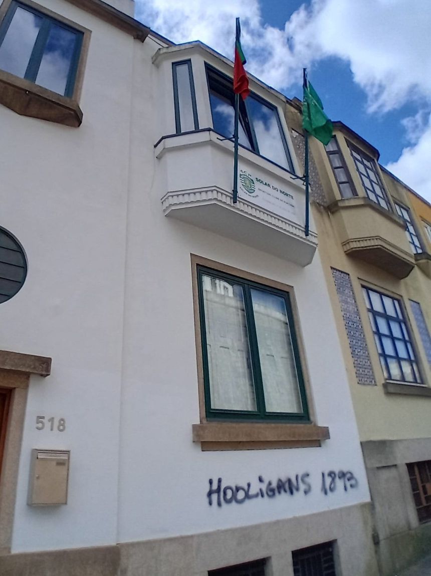 A fachada do Solar do Norte, núcleo do Sporting no Porto, foi vandalizada esta madrugada, segundo denúncia da página Bancada de Leão no X.