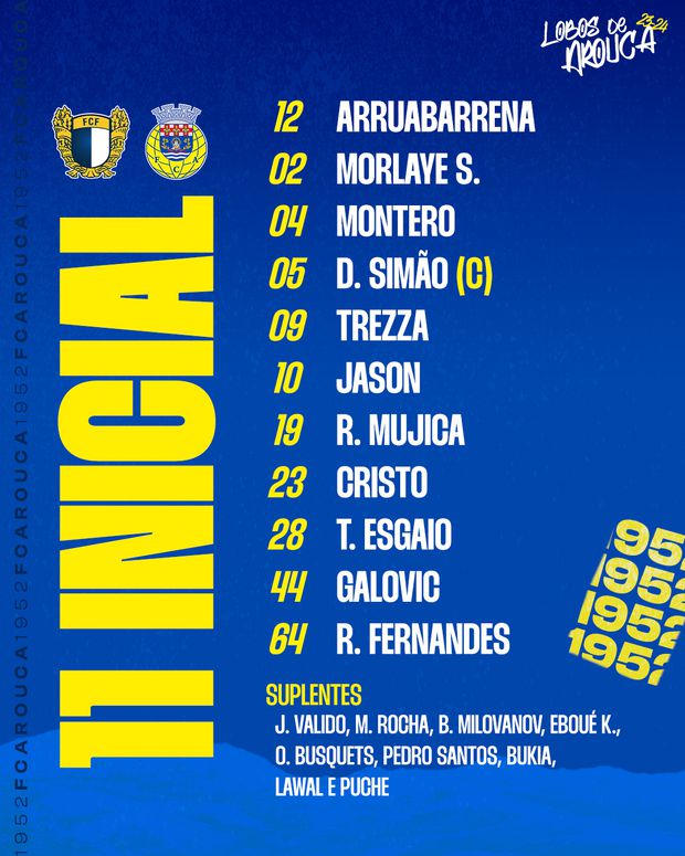 Arouca: Arruabarrena (12); Rafael Fernandes (64), Galovic (44) e Javi Montero (4); Trezza (9), Morlaye Sylla (2), David Simão (5) C e Tiago Esgaio (28); Cristo González (23), Rafael Mújica (19) e Jason Remeseiro (10)