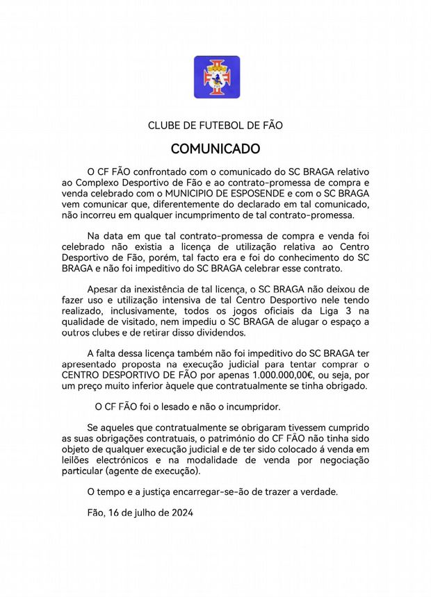 «O CF Fão, confrontado com o comunicado do SC Braga relativo ao Complexo Desportivo de Fão e ao contrato-promessa de compra e venda celebrado com o Município de Esposende e com o SC Braga, vem comunicar que, diferentemente do declarado em tal comunicado, não incorreu em qualquer incumprimento de tal contrato-promessa. Na data em que tal contrato-promessa de compra e venda foi celebrado não existia a licença de utilização relativa ao Centro Desportivo de Fão, porém, tal facto era e foi do conhecimento do SC Braga e não foi impeditivo do SC Braga celebrar esse contrato. Apesar da inexistência de tal licença, o SC Braga não deixou de fazer uso e utilização intensiva de tal Centro Desportivo, nele tendo realizado, inclusivamente, todos os jogos oficiais da Liga 3 na qualidade de visitado, nem impediu o SC Braga de alugar o espaço a outros clubes e de retirar disso dividendos. A falta dessa licença também não foi impeditiva do SC Braga ter apresentado proposta na execução judicial para tentar comprar o Centro Desportivo de Fão por apenas 1.000.000,00€, ou seja, por um preço muito inferior àquele que contratualmente se tinha obrigado. O CF Fão foi o lesado e não o incumpridor. Se aqueles que contratualmente se obrigaram tivessem cumprido as suas obrigações contratuais, o património do CF Fão não tinha sido objeto de qualquer execução judicial e de ter sido colocado à venda em leilões eletrónicos e na modalidade de venda por negociação particular (agente de execução). O tempo e a justiça encarregar-se-ão de trazer a verdade», lê-se.