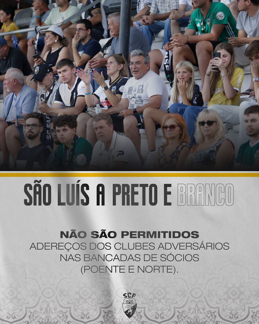 «São Luís a preto e branco». É desta forma que o Farense anuncia, nos seus canais de comunicação, a proibição de adereços de clubes adversários nas suas bancadas de sócios, aplicável já para o jogo com o Sporting, com início agendado para as 20:30h deste sábado, dia 30 de setembro. A restrição aplica-se às bancadas norte e poente do Estádio São Luís.